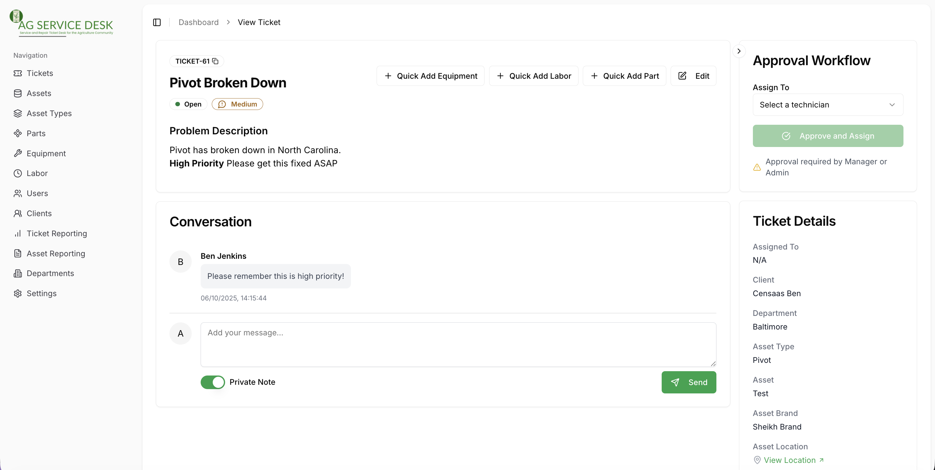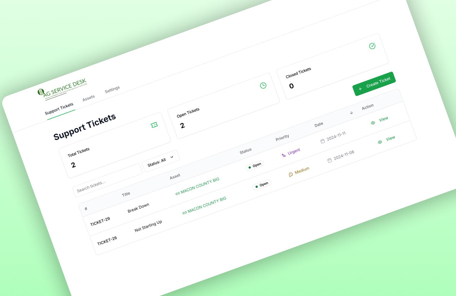 Asset and service desk platform built for agricultural businesses to manage equipment, technicians, and service requests across field and office teams. Designed with an industry insider to replace paper-based workflows with a modern, mobile-first system.